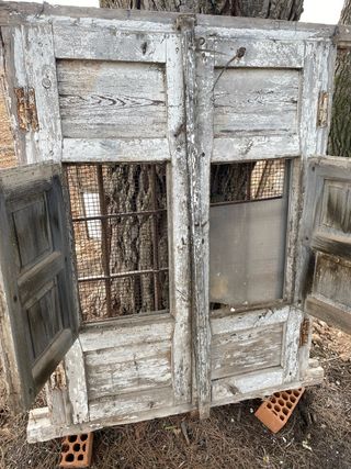 Conjunto de dos puertas antiguas de madera con un aspecto rústico y desgastado. - Madera con pintura blanca desconchada. - Bisagras metálicas oxidadas. - Diseño de paneles. - Ideal para decoración o proyectos de restauración.