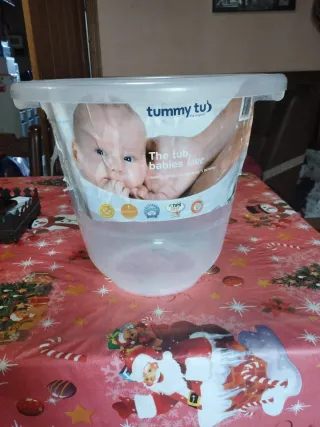 Bañera ergonómica Tummy Tub, diseñada para el confort del bebé. Prácticamente nueva, con pegatinas original puesta. - Forma que recuerda al útero materno. - Facilita el baño de recién nacidos. - Material transparente.