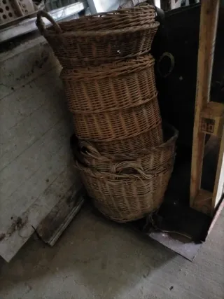 Conjunto de cestas de mimbre de diferentes tamaños. - Material natural tejido. - Tonos beige y marrón.