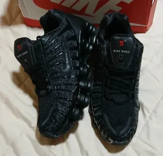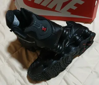 Zapatillas Nike Shox en color negro con detalles en rojo. Diseño moderno y llamativo. - Parte superior de malla y sintética. - Sistema de amortiguación Shox. - Suela de goma para mayor tracción.