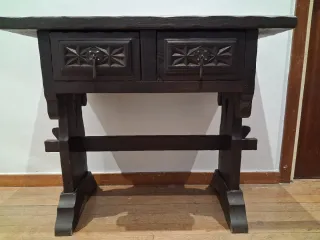 Elegante consola o aparador de madera con un diseño rústico y detalles tallados. - Dos cajones con tiradores metálicos. - Patas robustas con travesaño. - Acabado en madera oscura.