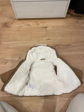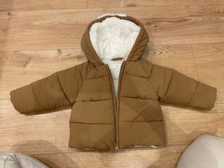 Abrigo acolchado de Mango para bebé.ñ, con forro interior de borreguito. Solo se ha usado 1 vez - Color marrón claro - Forro interior blanco de borreguito. - Capucha con dibujo - Cierre de cremallera.
