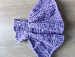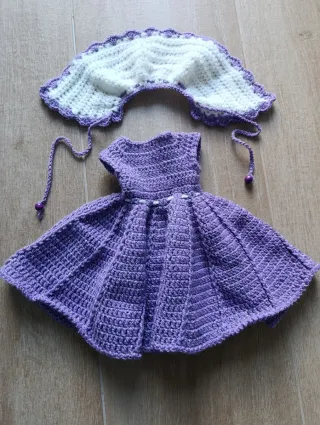 Conjunto de vestido morado y tocado a juego para muñeca Nancy. ( Nancy NO incluida) - Vestido de ganchillo morado con detalles blancos. - Tocado blanco con borde morado y cordones.