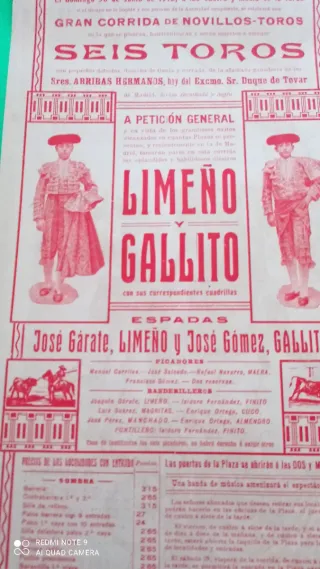 Cartel de la Plaza de Toros de Valencia del sábado 13 de julio de 1912. Presenta una corrida de novillos-toros con los diestros Limeño y Gallito. - Empresa de la Plaza de Toros de Valencia. - Gran corrida de novillos-toros. - Diestros: Limeño y Gallito. - Fecha: Sábado, 13 de julio de 1912. - Incluye sus correspondientes cuadrillas.