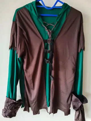 Disfraz de Robin Hood que contiene: - Camiseta con capucha - Cinturón - Cubre botas Pecho: 50 cm (de lado a lado) (Se recomienda llevar un pantalón normal negro y un arco con flechas)