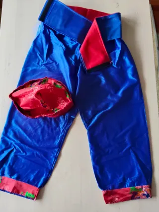Conjunto de disfraz de estilo chino para niños. - Camisa roja - Pantalón azul - Gorro rojo - Cinturón azul Medidas: Camisa: Pecho 99 cm (de lado a lado) Pantalón: Cintura (de goma): 32 cm (sin estirar) Largo: 83 cm