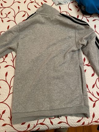Chaqueta deportiva de Adidas en color gris. - Diseño con las icónicas tres rayas en las mangas. - Cuello alto. - Cierre de cremallera frontal. - Regalo el chaleco azul con capucha