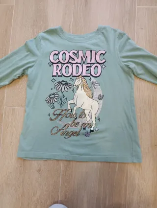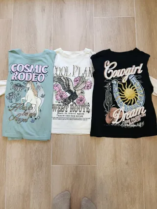 Conjunto de tres camisetas para niña con diseños divertidos. - Camiseta verde con unicornio y Cosmic Rodeo. - Camiseta blanca con águila y Cool Planet West Route. - Camiseta negra con herradura y Cowgirl Dream.