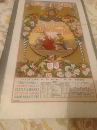 Cartel de la corrida de toros de Bilbao del año 1915. Presenta un diseño clásico con motivos florales y una escena taurina. - original 40x23 cm - Matadores: Vicente Pastor, Castor J. Ibarra, Rodolfo Gaona, Juan Belmonte. - Ganaderías: Miura, Murube, Pablo Romero, Gamero Cívico, Lantes Parlade, Santa Coloma. - Fechas: 22, 23, 24, 25 y 29 de agosto.
