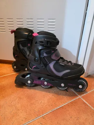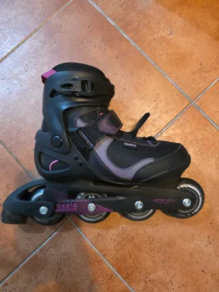 Patines en línea de la marca Oxelo, en color negro con detalles en rosa y lila. - Talla 38 - Cierre con velcro y hebilla. - Ruedas de poliuretano. - Incluye funda y protecciones. -Utilizado muy pocas veces, ya se ven las ruedas que están casi nuevas.