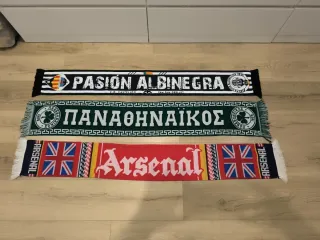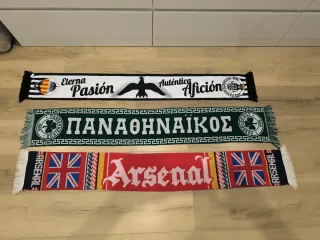 Conjunto de8 bufandas de fútbol de diferentes equipos. - Bufanda del Arsenal con Union Jack. 8€ - Bufanda del Panathinaikos FC. 7€ - Bufanda del CD Castellón Pasión Albinegra. 14€ - Bufanda del Oporto ( o glorioso) 7€ -Bufanda del Deportivo de la Coruña 7€ - Bufanda de la Real Sociedad 7€ - Bufanda del Pontevedra CF 10€ - Bufanda del Olympiacos 7€ Bufandas desde 7€ a 14€ . Se hace descuento llevando todo el lote o varias Bufandas