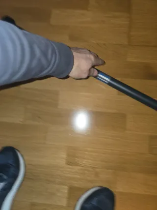 Palo de hockey de madera con detalles en azul y naranja. - Marca: Reno - Material: Madera - Color: Madera natural con banda azul y naranja