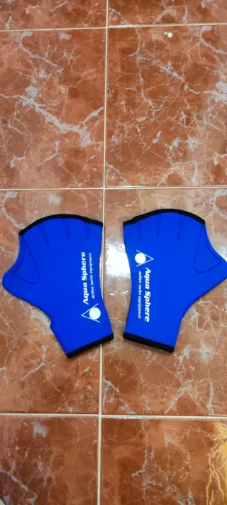 Par de guantes de natación Aqua Sphere en color azul,talla M,ajustables y con velcro. - son de neopreno con palma engomada de muy buena calidad. - Diseño ergonómico para mayor comodidad. - Material flexible y resistente al agua.