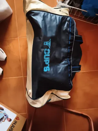 Bolsa de viaje de hockey con diseño deportivo en azul y amarillo. - Compartimento principal espacioso. - Bolsillos laterales con cremallera. - Asas de mano y correa para hombro. - Logo McRol bordado en la parte frontal.