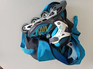 Set de patines en línea para niños, guardados en su bolsa de transporte. Talla 38-41. - Diseño en azul, blanco y negro. - Cierre de velcro y hebilla en los patines. Regalo bolsa de transporte azul con tira para colgar del hombro.