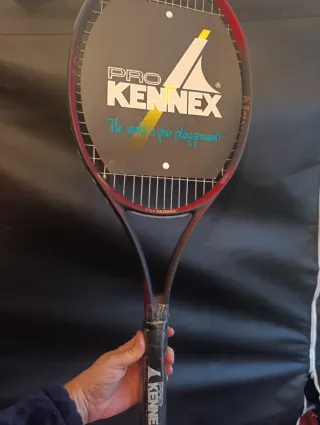 Raqueta de tenis Pro Kennex con diseño deportivo. - Marco de color rojo y negro. - Cuerdas blancas. - Mango con agarre negro.