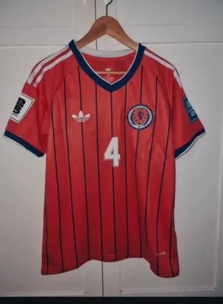 Camiseta de fútbol de Escocia, talla M, con el dorsal número 4 de McTominay. Scotland World Cup - Diseño a rayas verticales rojas y azules. - Logo de Adidas y escudo de Escocia. - Mangas con detalles blancos y azules.