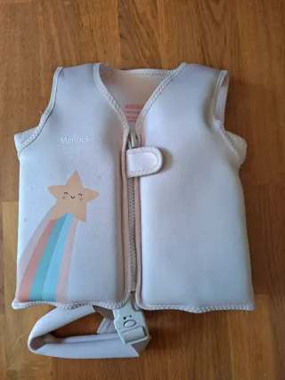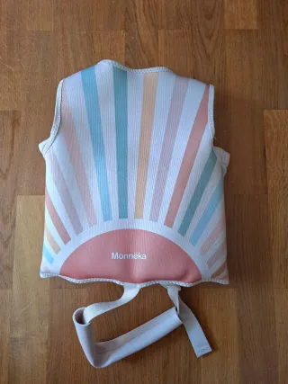Chaleco salvavidas infantil Monneka, ideal para niños de 1 a 2 años. Es de color rosa claro y tiene un diseño de estrella y arcoíris. - Perfecto estado. - Cremallera frontal. - Cierre de seguridad en la cintura. -ocho compartimentos con tres planchas de espuma cada uno que se pueden poner y quitar para regular la flotabilidad del niño. -Medidas: 25 x 30 x 5 cm. Contorno pecho aproximado: 46 a 50 cm