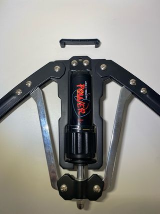 Equipo de fitness para entrenamiento de fuerza en brazos, hombros, pecho y bíceps: - Diseño ergonómico con mangos de goma naranja y negro. - Mecanismo de resistencia hidráulica ajustable. - Estructura metálica robusta.
