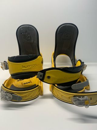 Fijaciones de snowboard de la marca Burton en color amarillo. Tienen las cinchas rotas como se puede ver en las fotos, pero son fácilmente reemplazables - Diseño deportivo. - Correas ajustables. - Hebillas de plástico transparente.