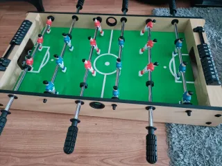 Futbolín de mesa para niños. Ideal para horas de diversión. - Campo de juego verde. - Jugadores rojos y azules. - Barras con mangos negros. - Marcadores de puntos en cada extremo.