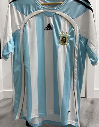El debut de una era. Diseño icónico "Teamgeist" del Mundial 2006, el primero de Leo Messi. Una pieza cargada de nostalgia con los paneles curvos y vivos dorados que definieron el fútbol de mediados de los 2000. - Diseño a rayas celestes y blancas. - Logo de Adidas y escudo de la AFA. - Talla L. - Estado: Como nueva. Sin manchas ni desgaste en el tejido. - logo y escudo bordados