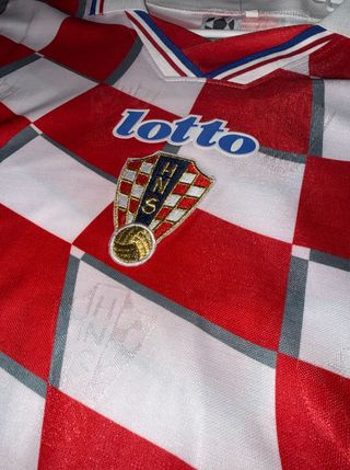 La revelación del 98. La inolvidable camiseta de cuadros al viento con la que Davor Šuker llevó a Croacia al bronce mundial. Un diseño que rompió moldes. - Diseño a cuadros rojos y blancos característico. - Escudo de la HNS (Federación Croata de Fútbol) con detalles dorados. - Talla L. - Estado: Como nueva. El blanco es brillante e inmaculado. - Logo: El logotipo central de lotto es un vinilo plano termosellado