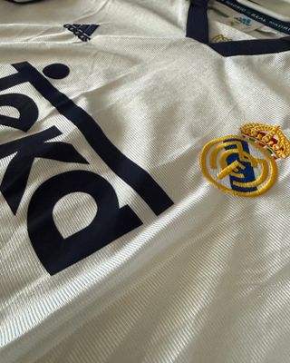 El Aguanis. La camiseta que evoca la magia de Raúl en la Intercontinental y la Séptima. Diseño clásico de finales de los 90 con detalles dorados y el patrocinador icónico de esa era dorada. - Diseño clásico blanco con detalles en azul marino y dorado. - Logo de Adidas y escudo del Real Madrid bordados. - Patrocinador Teka estampado en el frontal. - Talla: L. - Estado: Como nueva. Sin manchas.