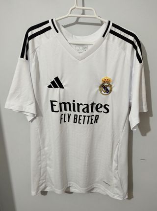 Camiseta de fútbol del Real Madrid para la temporada 24/25. - Diseño oficial Adidas. - Escudo del club bordado. - Logo de Emirates Fly Better. - Tecnología Aeroready.