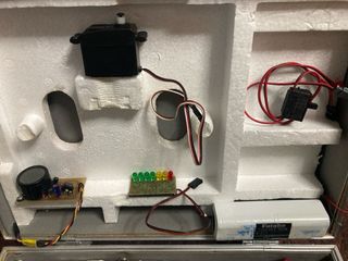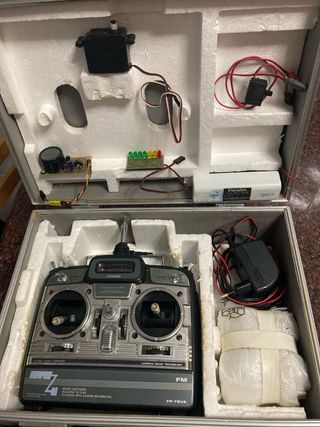 Lote de aeromodelismo que incluye -emisora Futaba 6 canales -1 servo - Cargador doble emisora y baterias receptor - Componentes varios - Incluye caja