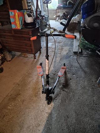 Patinete de tres ruedas con plataformas naranjas. - Plataformas con superficie antideslizante. - Manillar ajustable en altura. - Diseño de tres ruedas para mayor estabilidad.