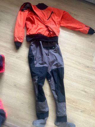 Traje seco Kokatat de color naranja y gris, diseñado para actividades acuáticas. - Parte superior naranja brillante. - Parte inferior gris y negra. - Cuello alto negro. - Puños y tobillos sellados.