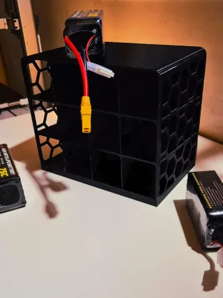 Caja negra para el almacenamiento de baterías LIPO. Diseñada para proteger tus baterías LIPO. - varios colores disponibles. - Diseño compacto y funcional. -Fabricado con impresora 3d en material resistente PETG. - Tamaño de cada celda 50x50x110mm