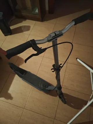 Patinete de color gris con un diseño moderno. - Manillar con puños de goma. - Freno en el manillar. - Plataforma antideslizante.