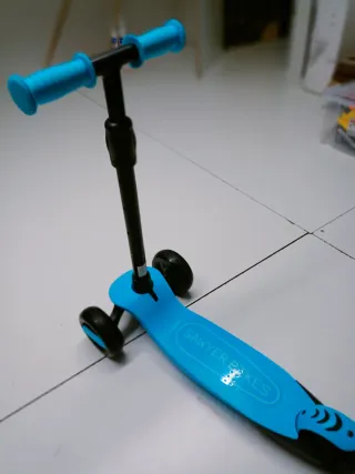 Patinete infantil de tres ruedas en color azul. - casco azul ( compra independiente pero incluido en el precio) - Plataforma antideslizante. - Puños de goma para un mejor agarre. - Ruedas delanteras dobles para mayor estabilidad. - luces en las ruedas led - Altura del manillar ajustable - Dispositivo de aprendizaje asistido