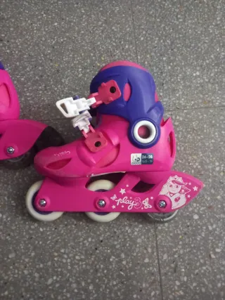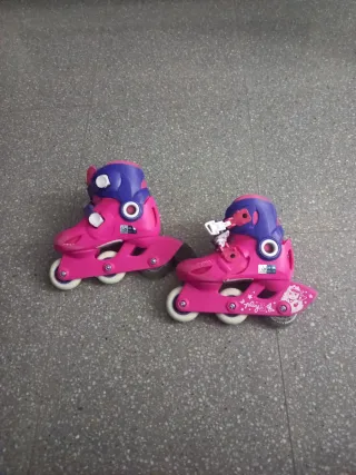 Patines ajustables en color rosa y morado, ideales para iniciarse en el patinaje. - Talla ajustable de 26 a 30. - Diseño con ruedas en línea. - Cierre de hebilla.
