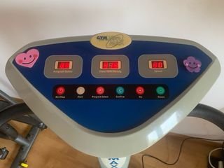Plataforma vibratoria Gym Vibro Max para ejercicios. - Pantalla digital para seleccionar programas, tiempo/BMI y velocidad. - Botones de control: On/Stop, Start, Program Select, Confirm, Up, Down. - Diseño con pegatinas decorativas de corazón y nube.