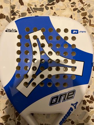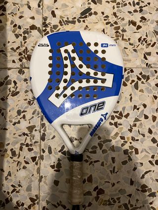 Pala de pádel Masspro modelo ONE con un grosor de 34 mm. - Diseño en blanco y azul. - Agujeros en la cara de la pala. - Mango con grip. - Ligera