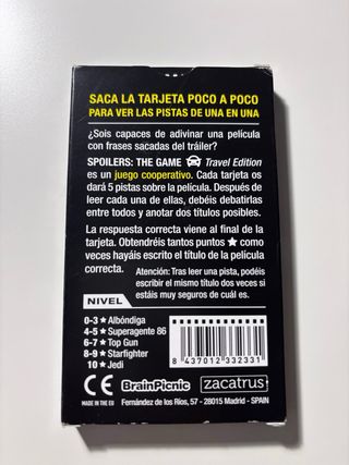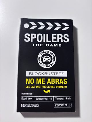 Juego de mesa Spoilers, edición de viajes Blockbusters. - Edad recomendada: 10+ años. - Jugadores: 1-8. - Tiempo de juego: 15 minutos. - Autor: Manu Palau. - Editorial: BrainPicnic / Zacatrus. Spoilers: Travel Edition es la versión de viaje del archiconocido Spoilers.Ahora, podrás disfrutar del entretenido juego de adivinar películas en cualquier lugar en el que te encuentres.