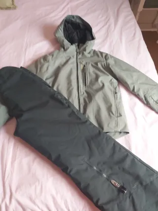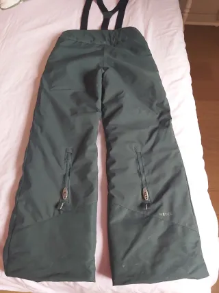 Conjunto de esquí para niño o niña de 10 años. - Chaqueta verde claro con capucha. - Pantalón verde oscuro. - Cremalleras visibles. - Waterproof level 10000 - Guata 100/m2 el pantalón y 150/m2 chaqueta. - Chaqueta modelo piste 550 y pantalón piste 500.