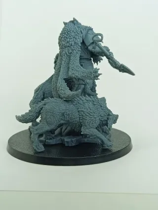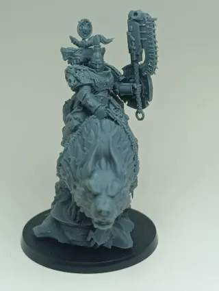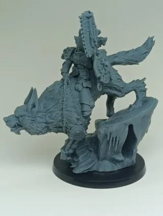 Miniatura de Marine Espacial de los Lobos Espaciales que representa un líder de Caballería Lobotrueno. Es impresa en una unica pieza, maciza, por lo que se envía montada tal cual. - Detallado diseño de un lobo con jinete. - Incluye arma y escudo. - Incluye peana de escenografía y peana de movimiento negra, tal cual la foto.