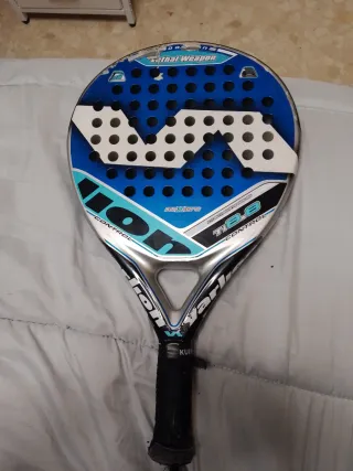 Pala de pádel Varlion LW 5 con funda. - Diseño con agujeros. - Detalles en azul y negro. - Empuñadura negra. Algunos roces pero funcional perfectamente.