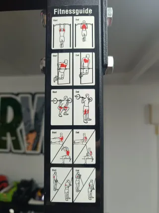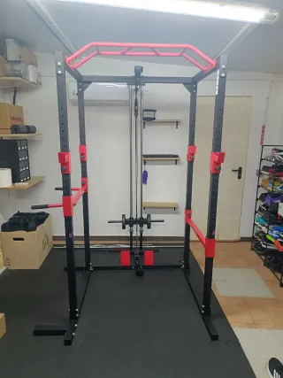Rack de musculación robusto con estructura principal en color negro y detalles en rojo. - Barra de dominadas integrada en la parte superior. - Sistema de polea para ejercicios. - Barras de seguridad ajustables. - Base amplia para mayor estabilidad. Está completamente nuevo,lo cambio por mejora de máquina y no tengo espacio para las dos,no tiene apenas un año y puedo demostrar con factura de compra,si te interesa tengo también en otro anuncio discos de 30mm en mi perfil más barras.