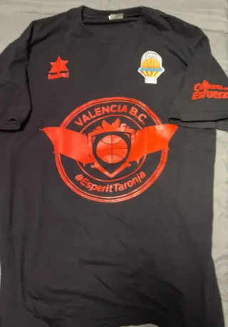 Camiseta negra del Valencia Basket con el escudo del equipo. - Talla L - Diseño con el escudo del Valencia B.C. - Inscripción #Esprit Taronja en el escudo. - Logo de Luanvi en la manga izquierda. - Inscripción Cultura de Esfuerzo en la manga derecha.