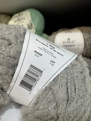 Ovillo de lana DMC Teddy en color gris, ideal para proyectos de bebés. - Textura suave y afelpada. - Hilo de pelo divertido. - Peso aproximado: 50g.