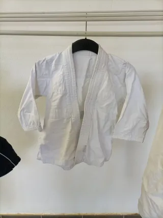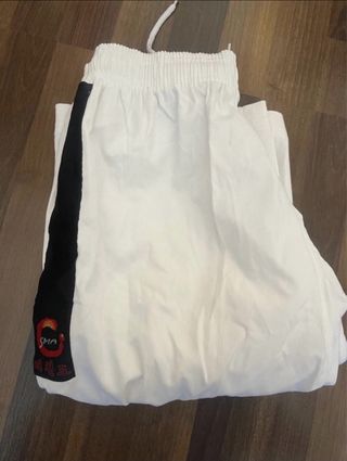 Traje de judo blanco, compuesto por chaqueta y pantalón. - Chaqueta con cuello reforzado. - Pantalón con cintura elástica y cordón.
