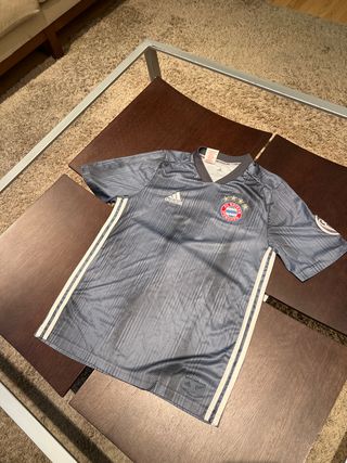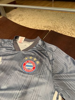Camiseta de fútbol del Bayern de Múnich. AUTÉNTICA. TIENDA OFICIAL MUNICH - Diseño en color gris con detalles blancos. - Logo de Adidas y escudo del club. - Tres rayas características de Adidas en las mangas.