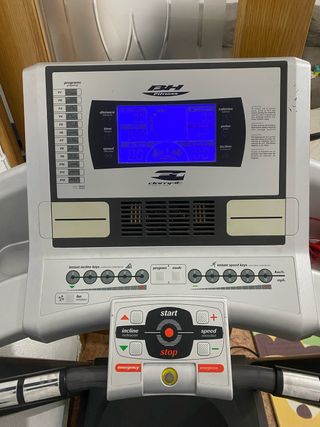 Cinta de correr BH Fitness con pantalla digital. Su precio nueva es de casi 1000€. - Programas preestablecidos. - Indicadores de distancia, tiempo, velocidad y calorías. - Botones de inicio rápido para inclinación y velocidad. - Tiene ventilador.