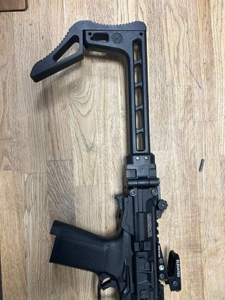 Pieza de repuesto para réplica de airsoft G&G SMC 9. - Fabricado en plástico negro. - Diseño ergonómico con textura. - Culatin trasero ergonómico para dos tipos de apoyo, normal y con altura, facilitando apuntar con casco.