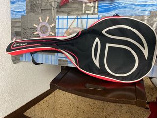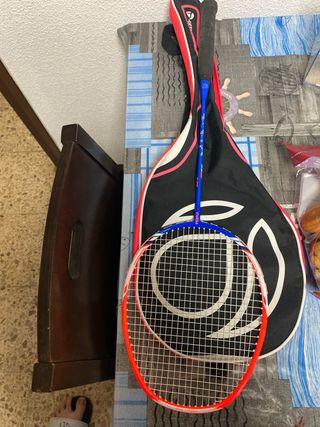 Raqueta de bádminton Artengo en buen estado, lista para jugar. Incluye funda protectora. - Raqueta de bádminton. - Funda protectora negra con detalles rojos y blancos. - Marca: Artengo.